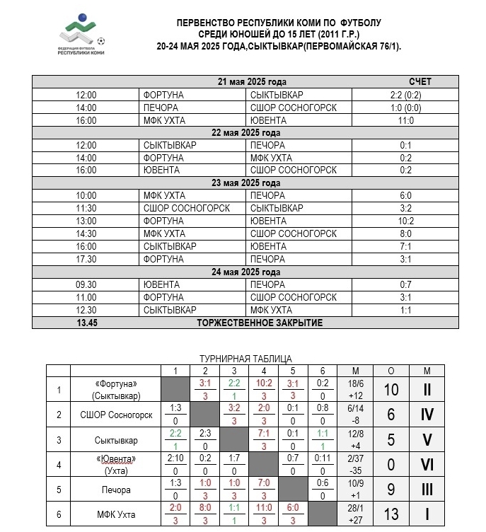 Победителями турнира стала команда Ухты. На ее счету 4 победы и 1 ничья. Вторыми финишировали представители столицы Коми («Фортура») — 3 победы, 1 ничья и 1 поражение. Бронзовые награды у Печоры — 3 победы и 2 поражения.